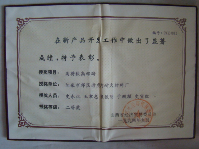 熱風(fēng)爐用低蠕變高鋁磚、高荷軟高鋁磚獲省科技進(jìn)步二等獎,微膨脹高鋁磚列入火炬計(jì)劃項(xiàng)目,炭素焙燒爐用特種高鋁磚已批準(zhǔn)國家專利